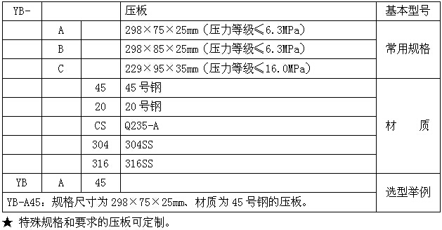 各种规格压板的螺栓孔径、孔数、螺栓孔间距等尺寸可按用户图纸或要求加工。